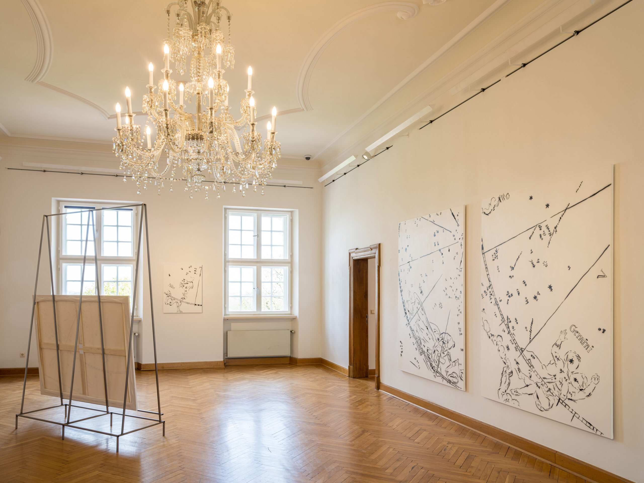 Conrad Hübbe präsentiert in der Ausstellung eine neue Serie von großformatigen Gemälden, in denen er sich sowohl mit den Hemisphären-Bildern von Albrecht Dürer als auch mit der Geschichte des Schlosses beschäftigt.