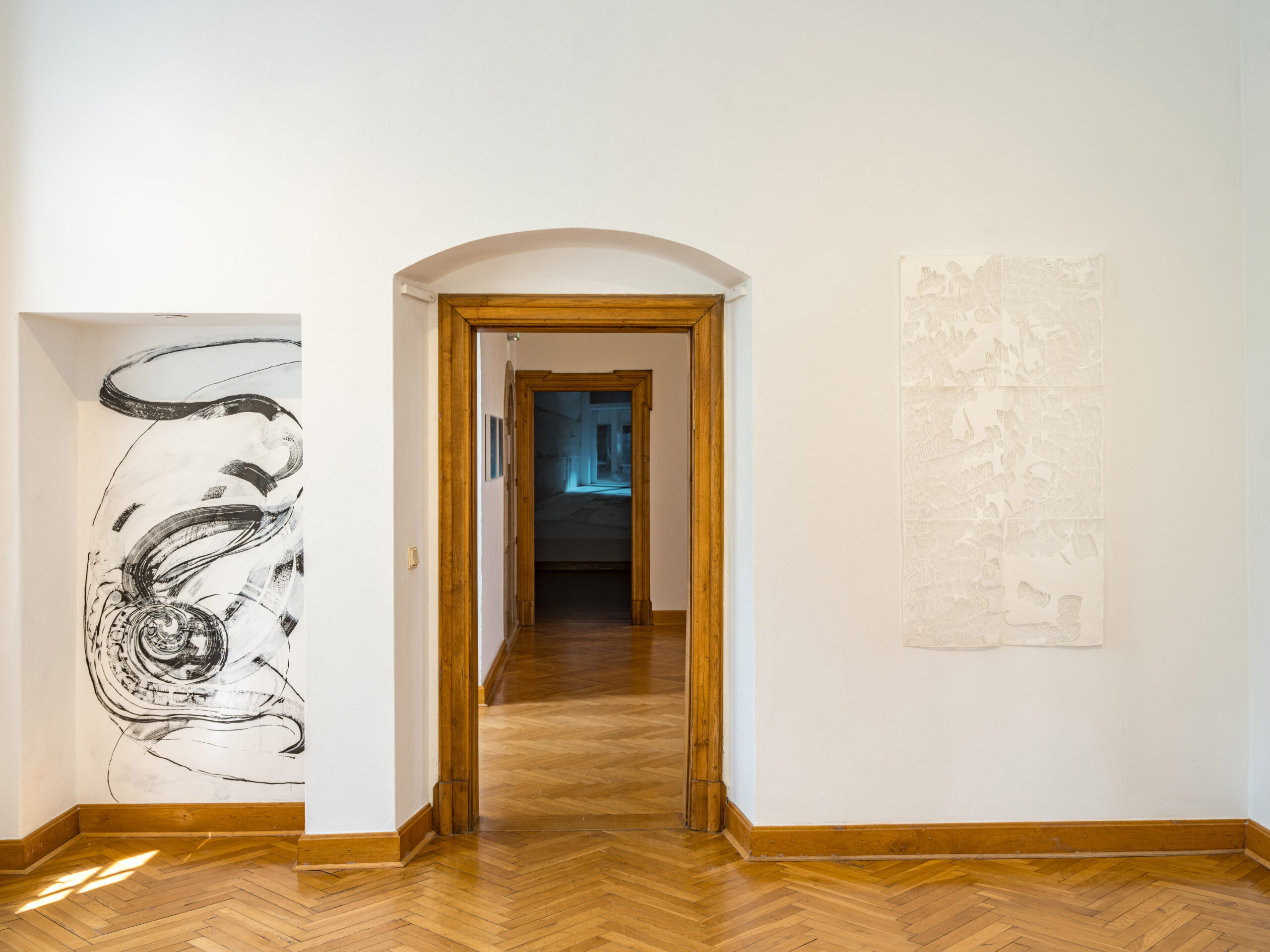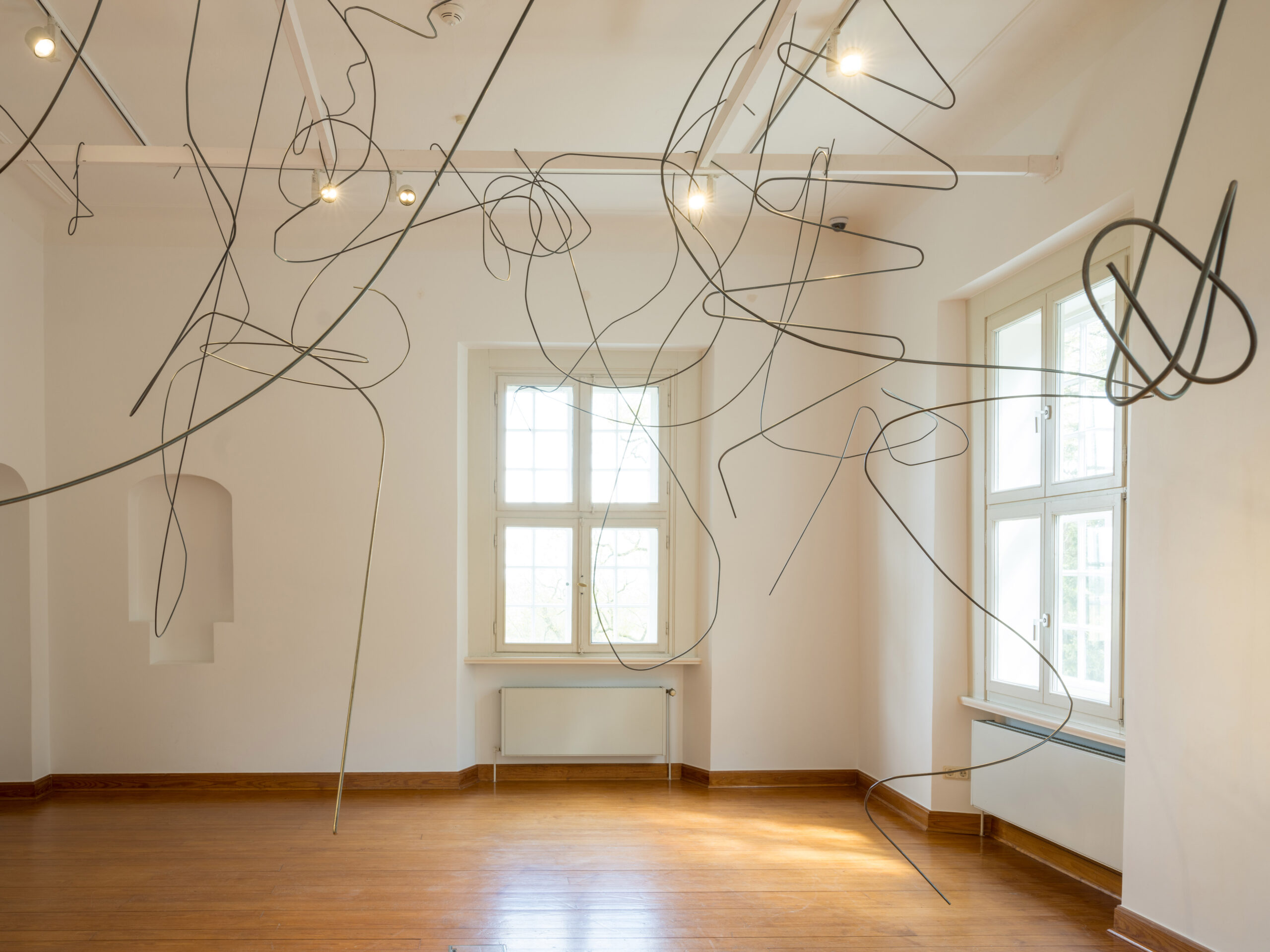 In einem weiteren Raum präsentiert die Bildhauerin und Zeichnerin Birte Bosse eine raumgreifende Installation aus gebogenen, dünnen Eisenstangen, die aus der Ferne an schwebende Linien im Raum erinnern, eine Arbeit, die ebenfalls eigens für die Ausstellung entwickelt wurde.