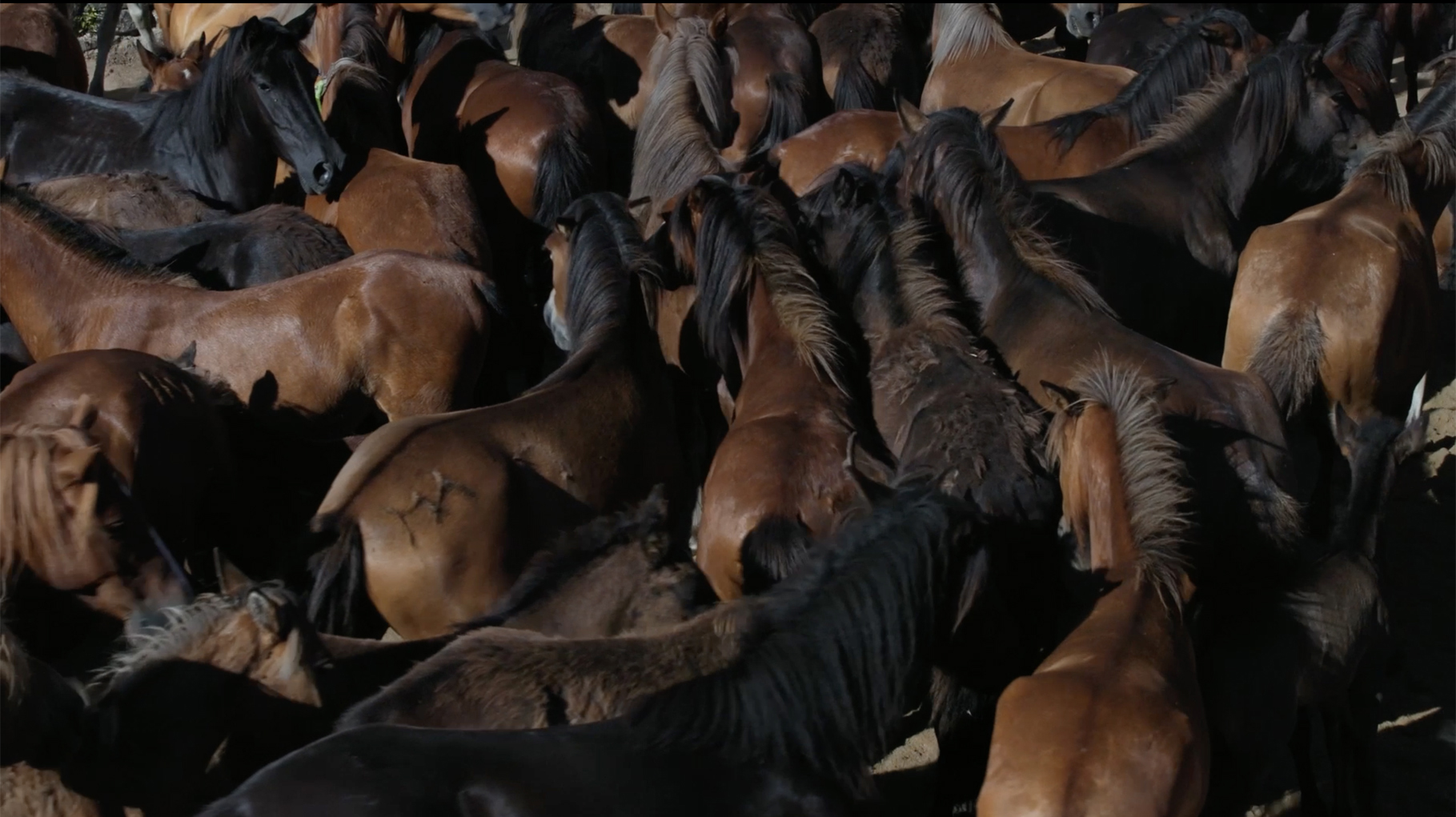 In ihrem Film „Curro“ (2023) zeigt die deutsch-iranische Künstlerin Yalda Afsah junge Männer, die in Galicien Wildpferde aus den Bergen in eine Arena (Curro) im Tal treiben, um dort die Mähnen der Tiere zu scheren und sie zu markieren. Yalda Afsah beobachtet zunächst die Vorbereitungen dieses jahrhundertealten Rituals und zeigt schließlich die dicht an dicht gedrängten Pferdkörper. Der Film verfolgt die zunehmend angespannte Dynamik der Begegnung zwischen Mensch und Tier in der Arena, die durch die Zähmung für einen Moment zum Stillstand gebracht wird. Das oben gezeigte Standbild aus dem Film „Curro“ zeigt zwei Männer, kurz nachdem sie die Mähne eines Pferdes geschoren haben, die scheinbar in einer engen Umarmung verharren, um das Tier ruhig zu halten.