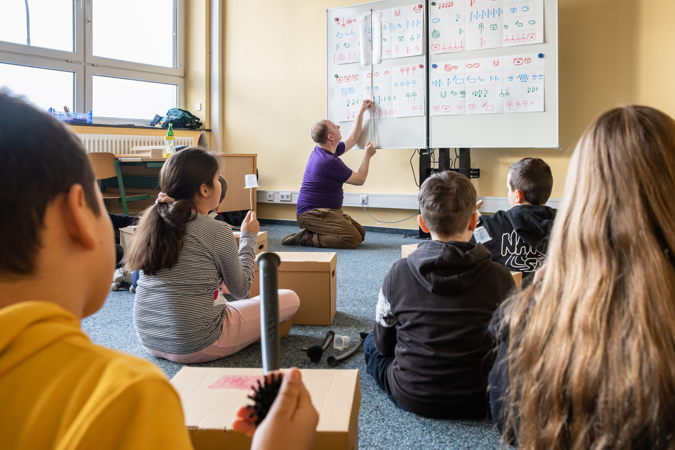 Schülerinnen und Schüler experimentieren mit Klängen und Geräuschen, und zwar voraussetzungsfrei, ohrenöffnend, forschend, mit Musikinstrumenten oder umfunktionierten Alltagsgegenständen.