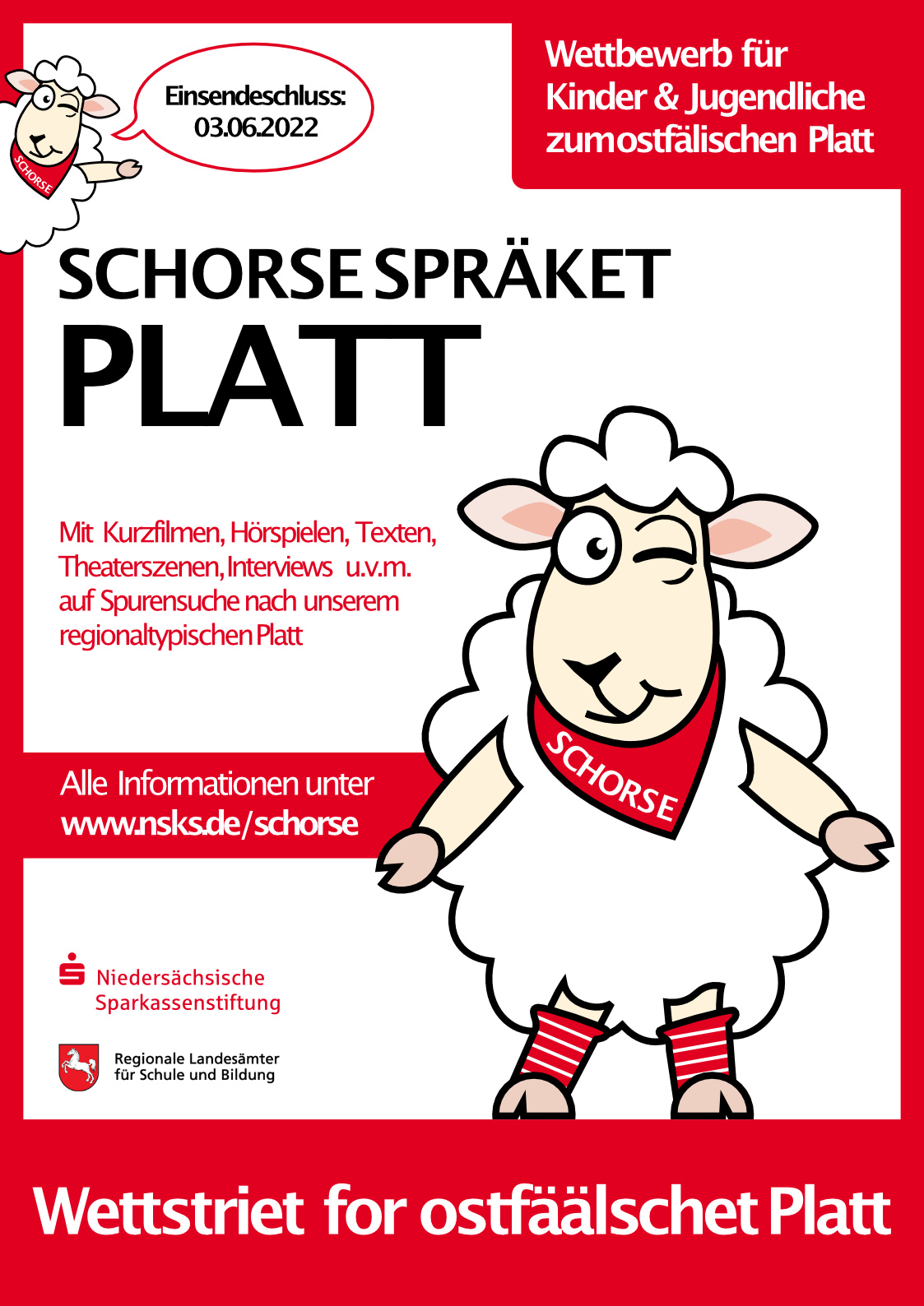 Der Wettbewerb „Schorse spräket Platt“ (Schorse spricht platt) der Niedersächsischen Sparkassenstiftung in Kooperation mit den Regionalen Landesämtern für Schule und Bildung in Niedersachsen startet in eine neue Runde. Dieser „Wettstriet for ostfäälschet Platt“ soll die Aufmerksamkeit auf den ostfälischen Dialekt des Niederdeutschen lenken, der noch heute zwischen Bückeburg und Helmstedt, von Hann. Münden bis in die südliche Lüneburger Heide gesprochen wird.